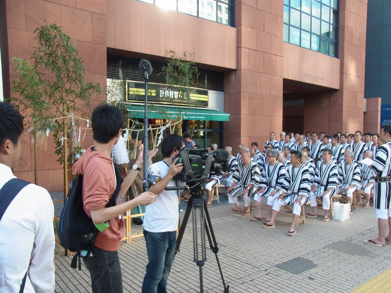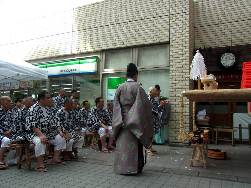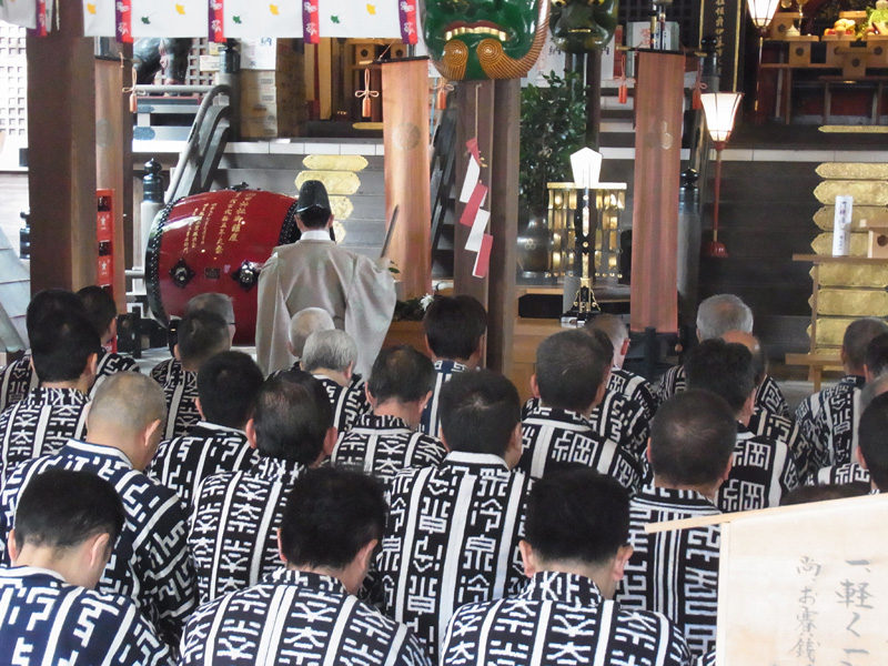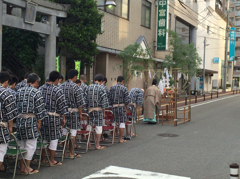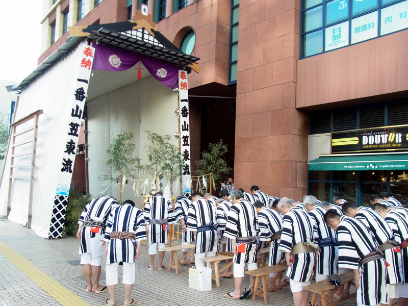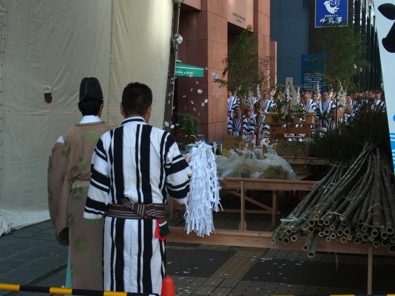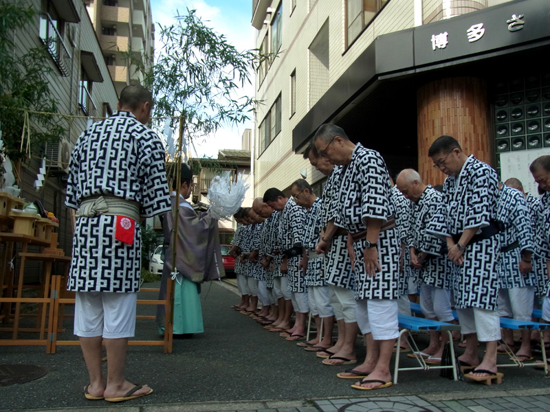 今年の一番山笠である東流は午前7時より注連下ろし祭を執り行いました。この時間帯になると博多の町は動きだし、通勤姿のサラリーマンや通行する人のの姿が多くなってきました。