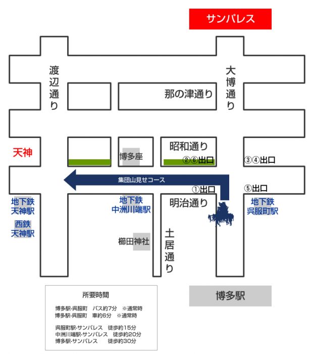 呉服町からサンパレスまで歩く場合、GoogleMapの徒歩検索では約15分、中洲川端からはですので、その時間を計算に入れて移動してください。