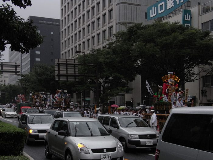 一番山笠 中洲流が呉服町から往路の出発を行うのが15時半。最後の七番山笠 東流が出発するのは16時です。