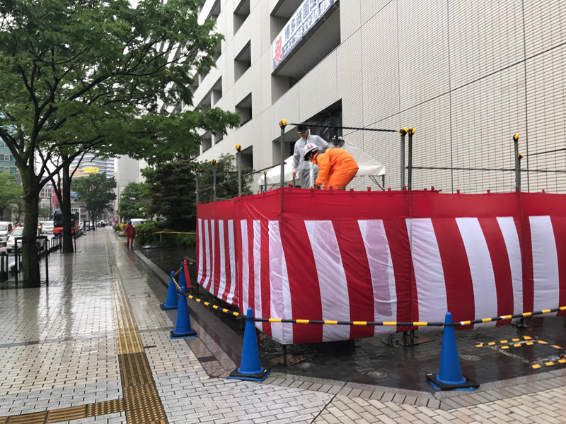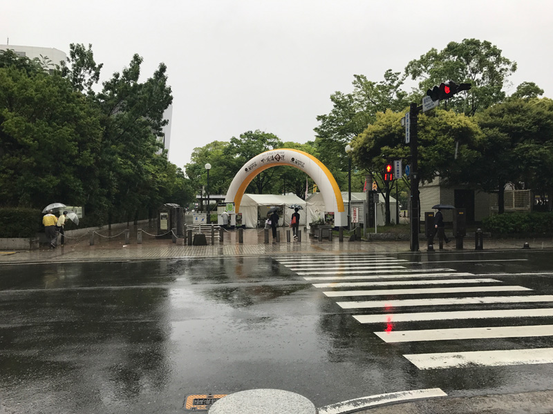 本日5月12日(金)は、あいにくの雨。時折強い雨脚になるという悪天候の中、市役所周辺ではイベントの準備、設営が行われていました。