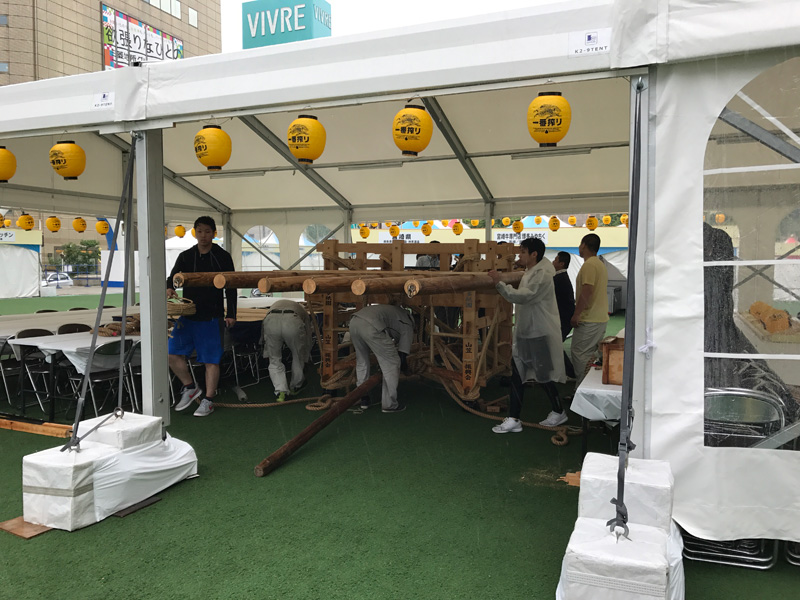 特別巡行に参加する博多祇園山笠は、午後2時ごろから棒締めを開始。この雨により急きょふれあい広場の大テントの中での棒締めとなりました。