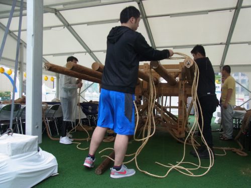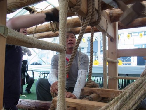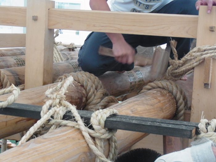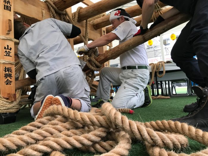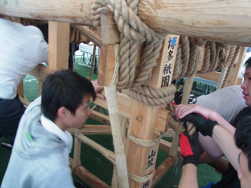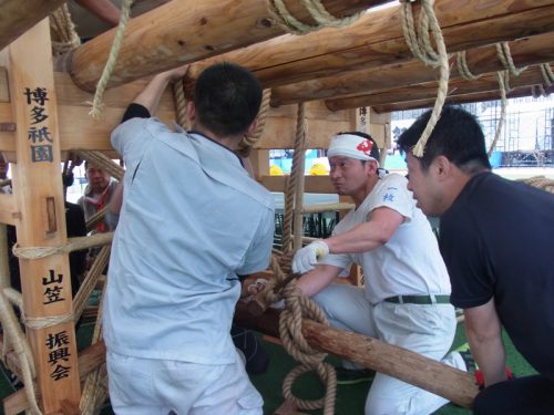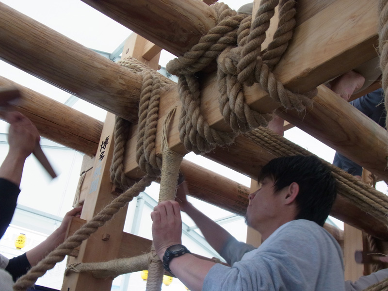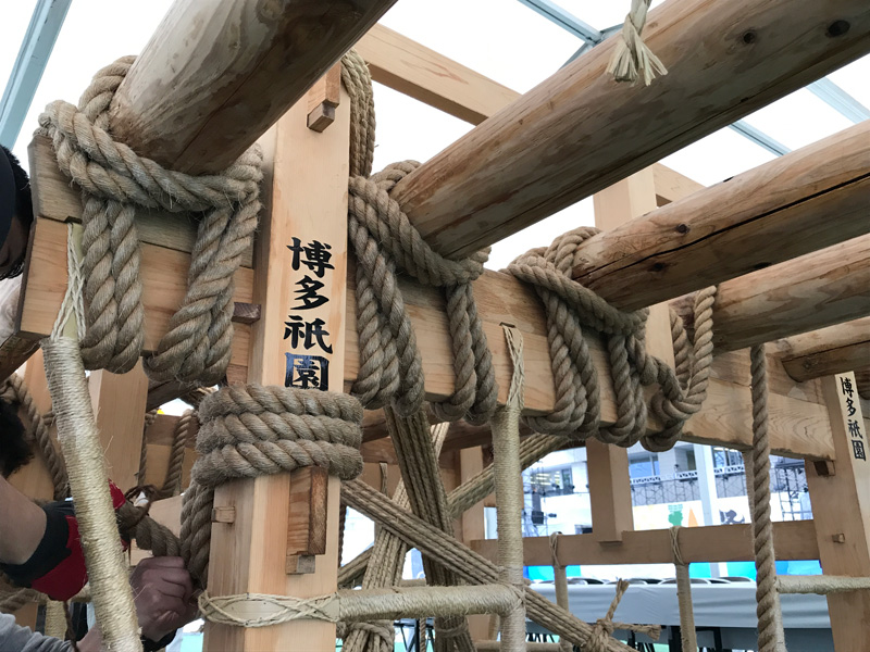 男たちの掛け声とともに、舁き棒が次々と山笠台へと据え付けられていきます。雨がテントを叩く音の中、棒を締めるギリギリという音とカンカンという木槌の音が響き、摩擦で縄の香りがうっすらと辺りに漂います。
