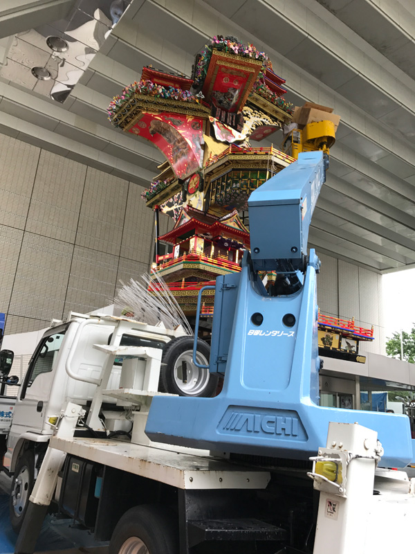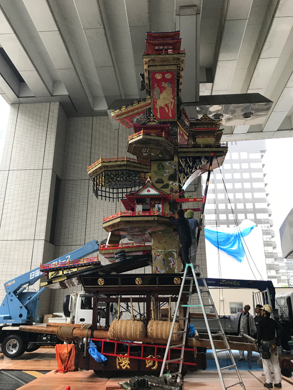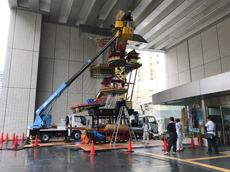 同時間帯に市役所玄関では、日田の山鉾の準備が行われており、歩いている人達の注目を浴びていました。
