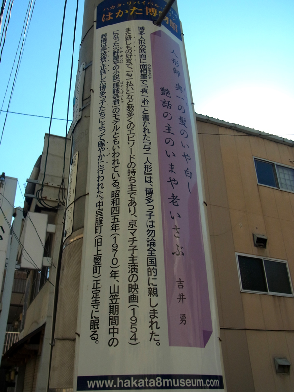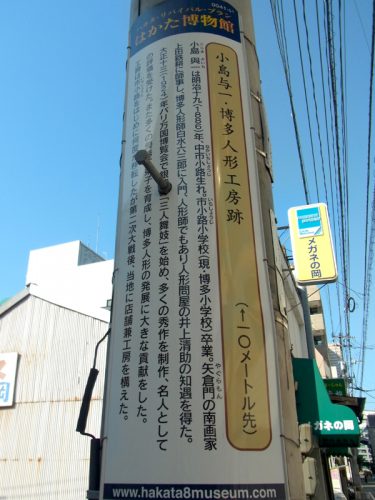 今年の当番町は綱場町。山小屋は、綱場本通り沿いの駐車場に建てられることになります。そばの電柱の説明では、博多人形の第一人者である小島与一氏の工房があった通りだということです。
