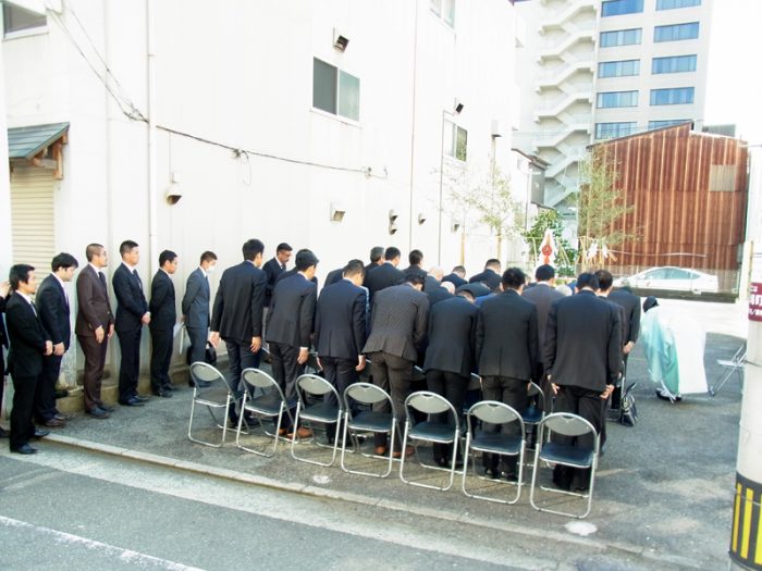 長法被の着用ができるのは山笠準備期間が始まる6月1日からであるため、山笠の様々な神事の中で唯一スーツ姿の行われる神事がこの恵比須流の地鎮祭となります。