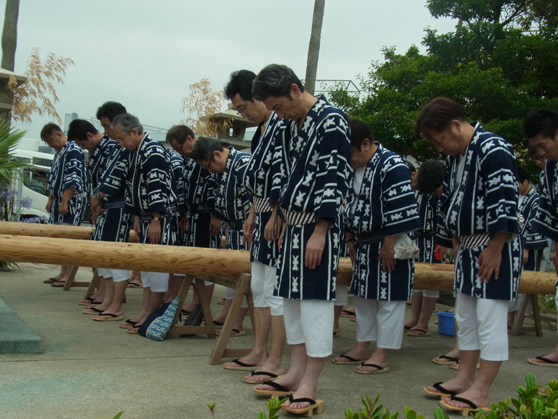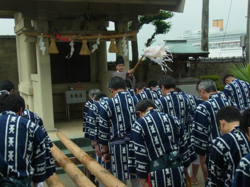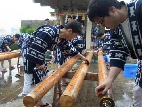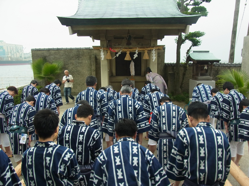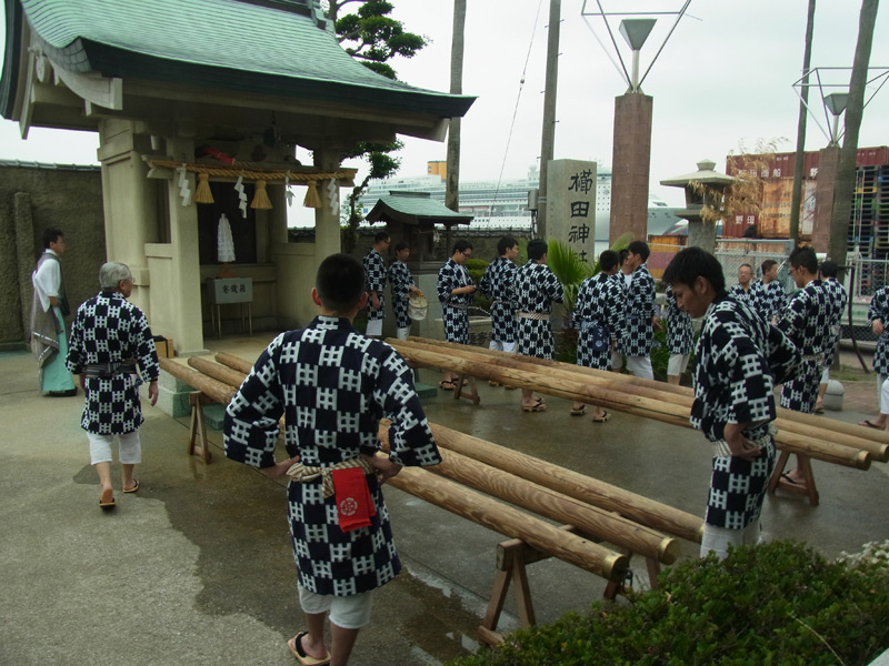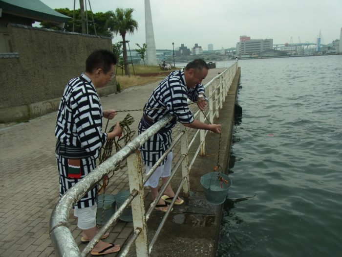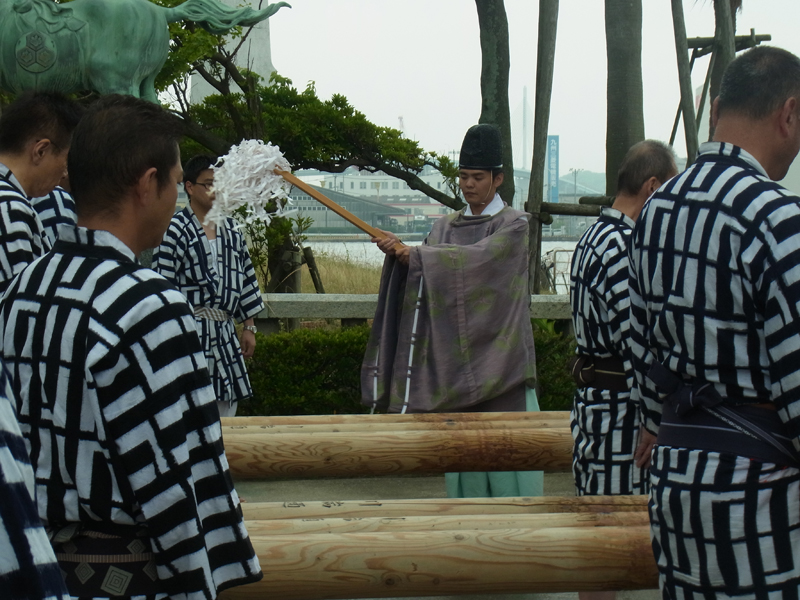 まずは海水を博多湾からくみ上げます。今日は満潮だったのか水位が高く、棒洗い行事のとしては珍しい日でした。