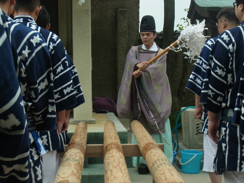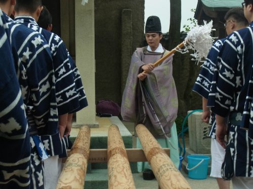 櫛田神社の神職が、舁き棒と棒を洗う道具を祓い清めた後、汲み上げた博多湾の海水で棒を洗い浄めました。
