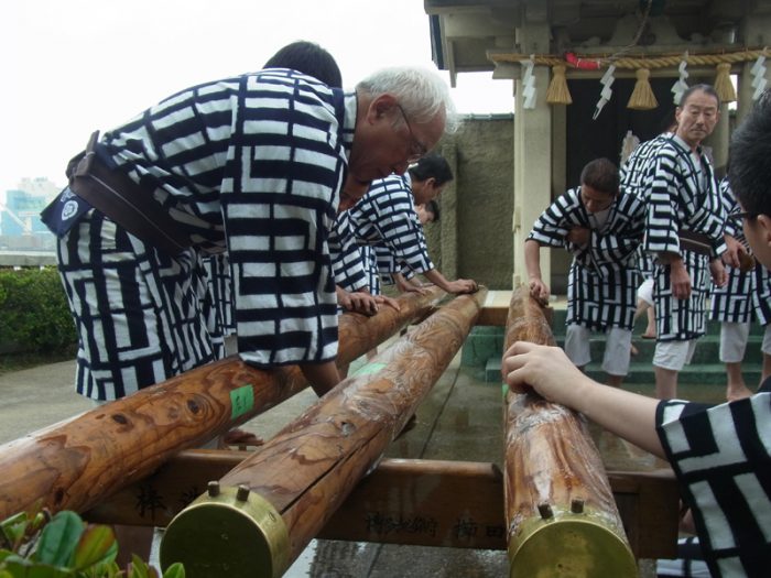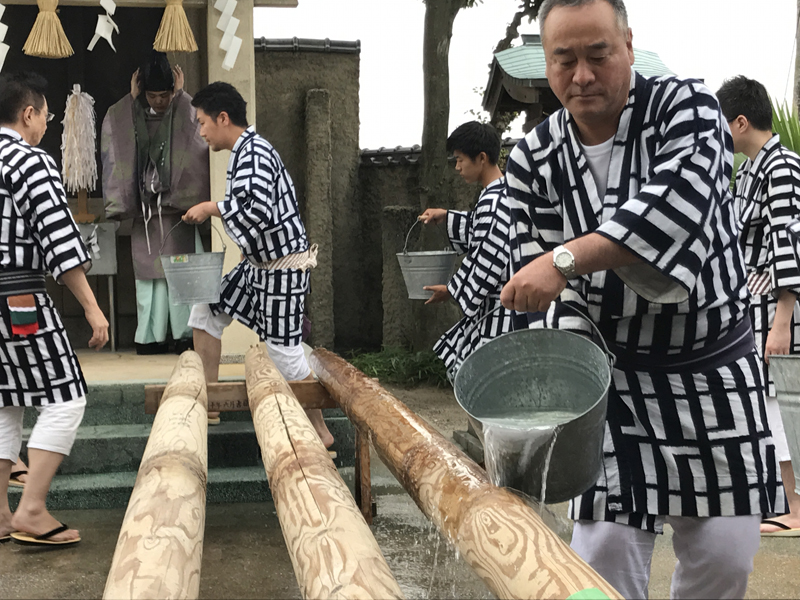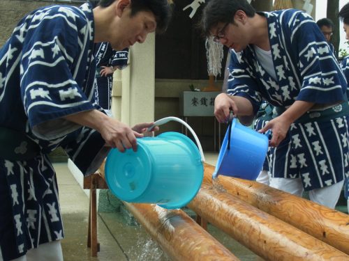 舁き棒が祓い浄められた後、先ほど汲み上げた海水で洗います。博多リバレインは、洗剤を使って一年間の誇りと汚れを丁寧に洗い清めていきます。