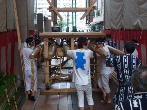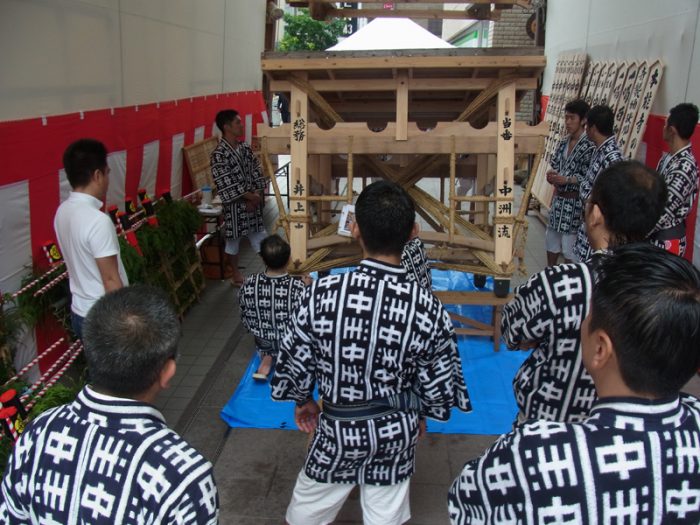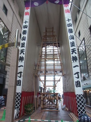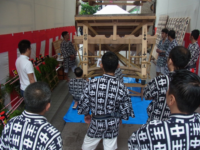 大丸エルガーラのアーケード内に建てられる十四番山笠 天神一丁目は、午前9時より博多ふ頭にある櫛田神社浜宮にて、棒洗いの神事を執り行いました。