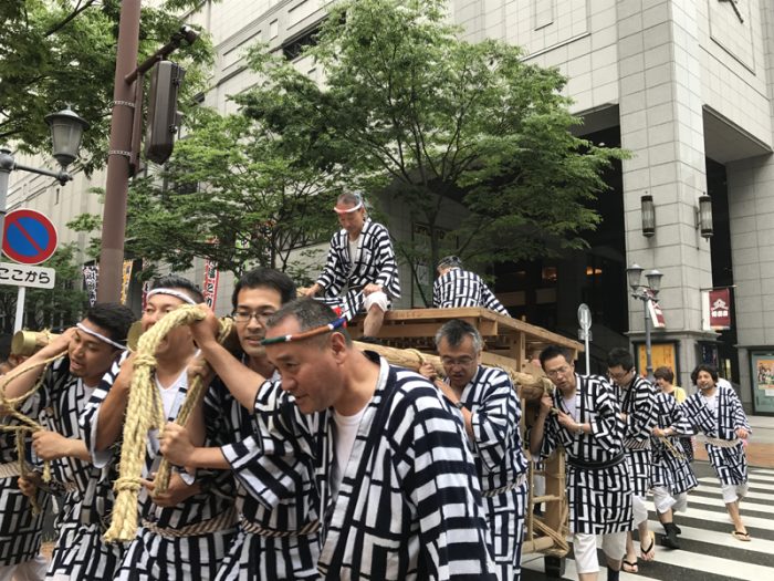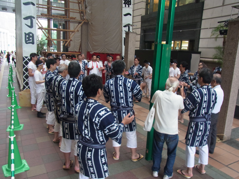 法被姿の男たちが山笠行事を行う様子は往来の人たちの目を引くようで、記念写真を撮る人の姿が多くみられました。