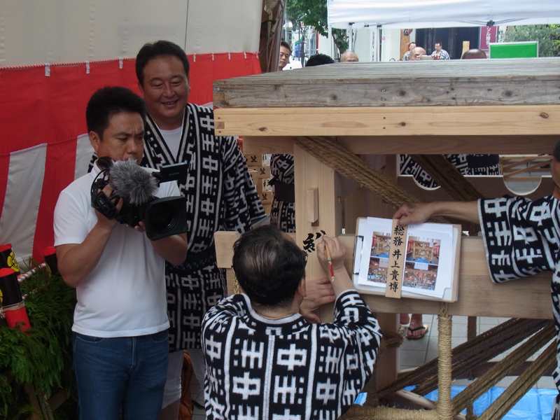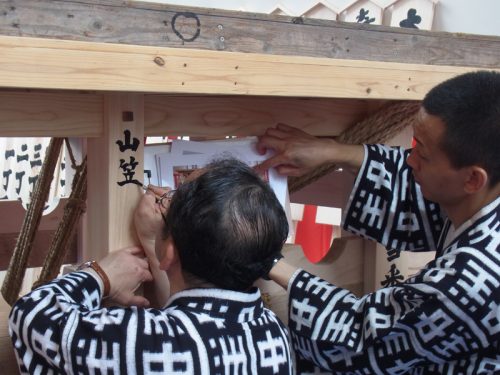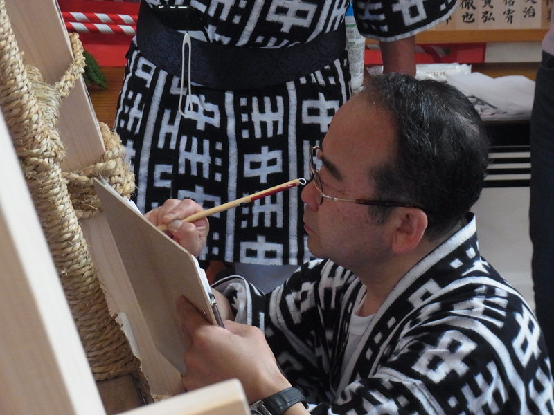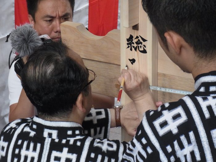 文字の配置とバランスを確認しながら、一筆一筆ゆっくりと丁寧に筆を入れていきます。その一筆の緊張を感じ、周囲にいる男衆も息を飲んでその筆の動きを見ています。