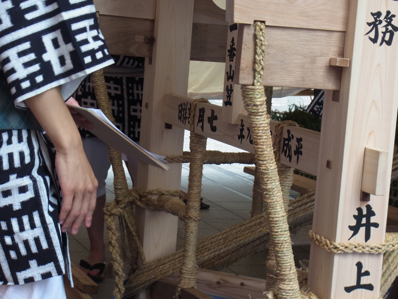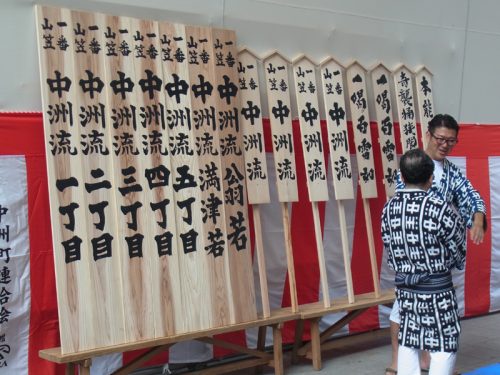 山笠台の表と見送りに総務の名前と中洲流の文字、横側に今年の日付が入り、無事筆下ろしが終了しました。