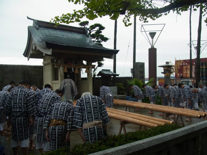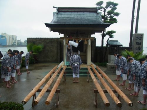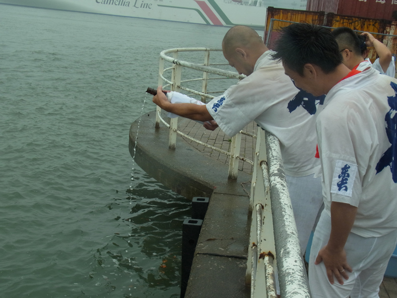 櫛田神社の神職がお祓いを行った後、祭壇に備えたお神酒を海に注ぎ入れ、その海の水をくみ上げ棒洗いの儀に使用します。