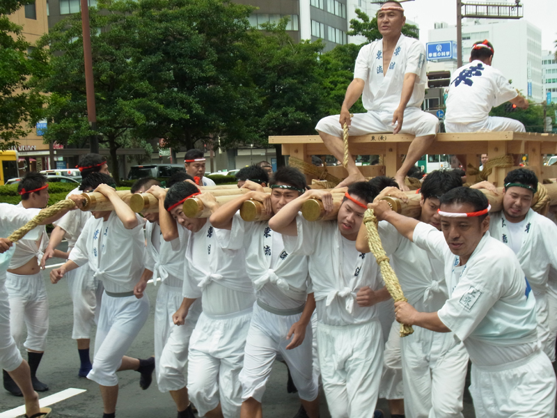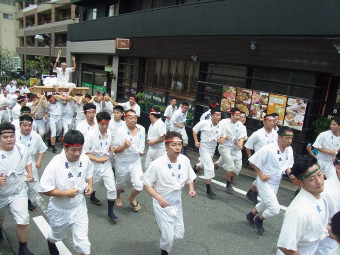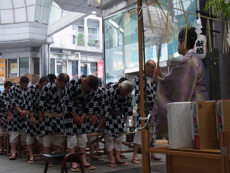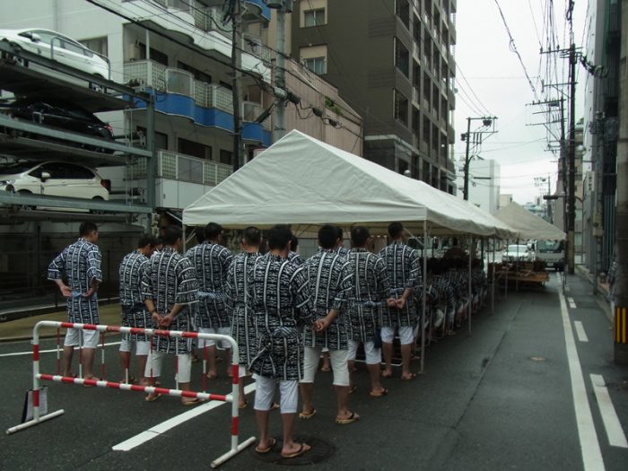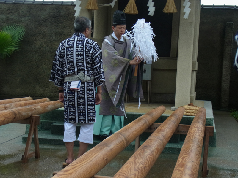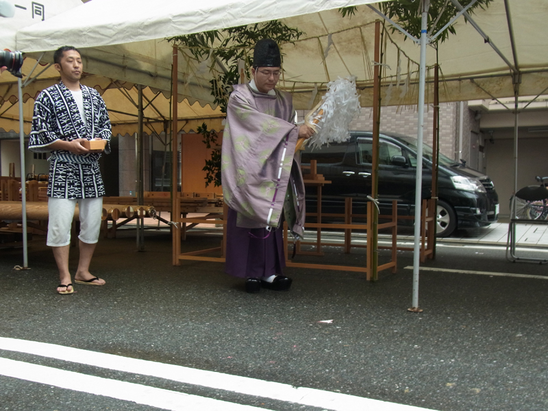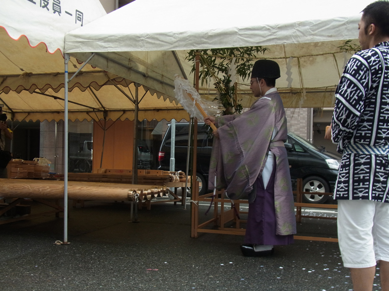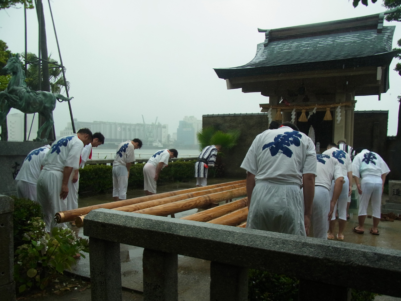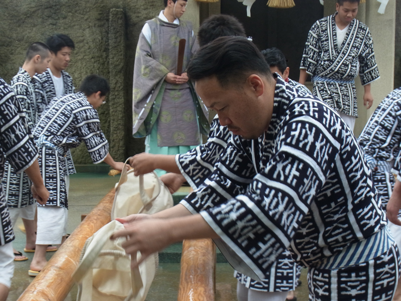 浄め祓いの儀では、神事に参加した男衆や人形師、山大工らが祓い清められ、山笠台と使用する道具も祓い清められます。