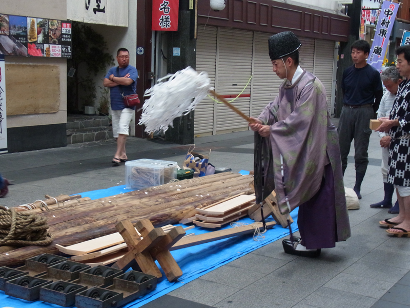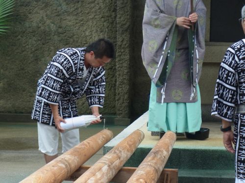 場所を浄めた後、山笠に使う道具や棒洗いを終えた舁き棒を表側と見送り側から、それぞれ祓い浄めました。