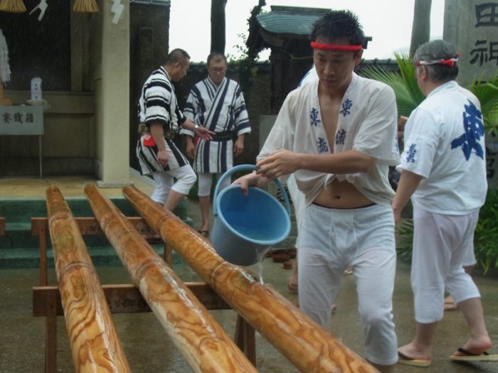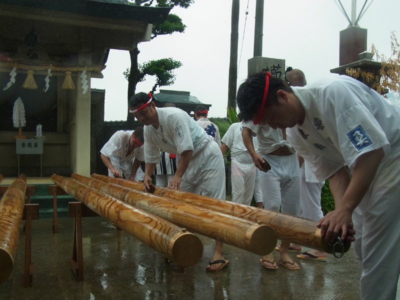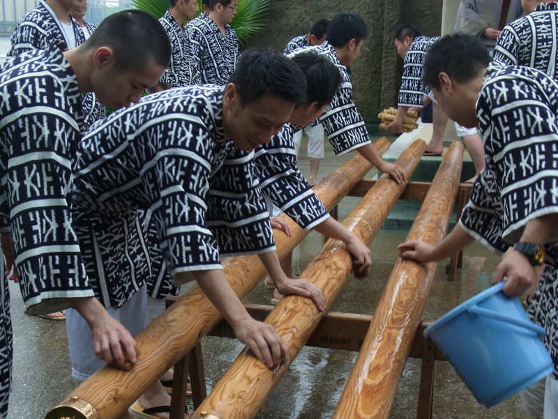 雨の中、男衆は全身濡れながら舁き棒の汚れを洗い落としました。