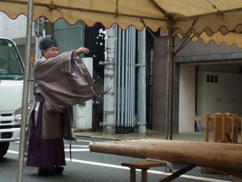浄め祓いの儀で、山小屋が建つ場所の四隅を櫛田神社の神職が祓い浄めます。