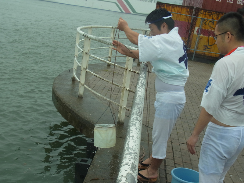 棒鼻にお神酒を掛けた後、棒洗いの儀へ。棒に付いた一年間の埃と汚れを、海水で洗い流しました。