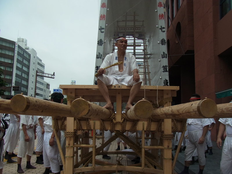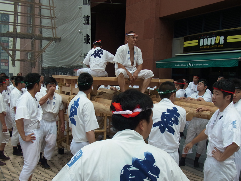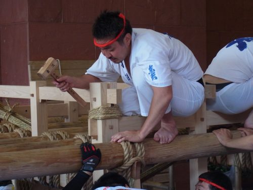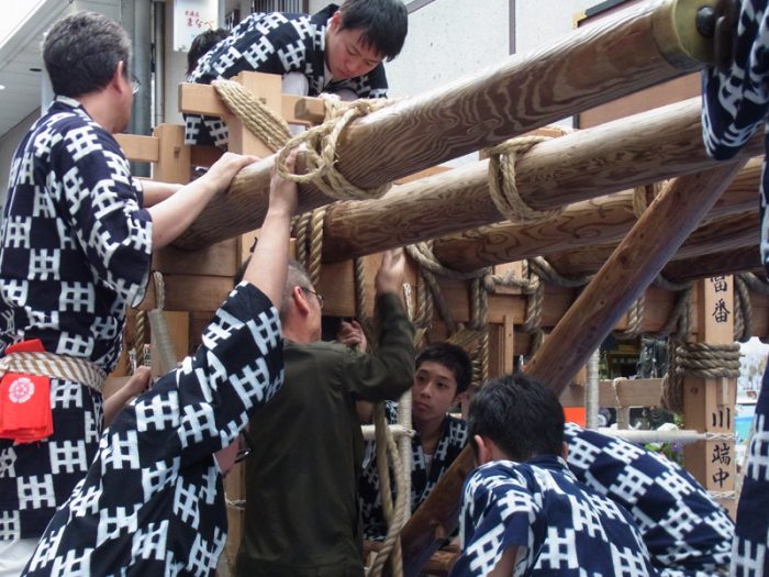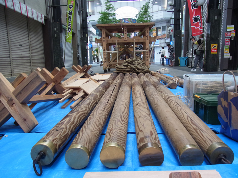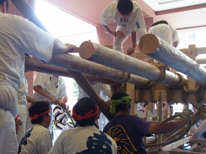小屋入り神事の後、早速棒締めが行われ、午後からは飾り山の骨組みとなる矢切(やぎり)が山笠台の上に建てられました。