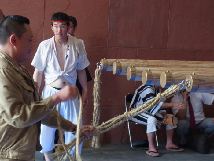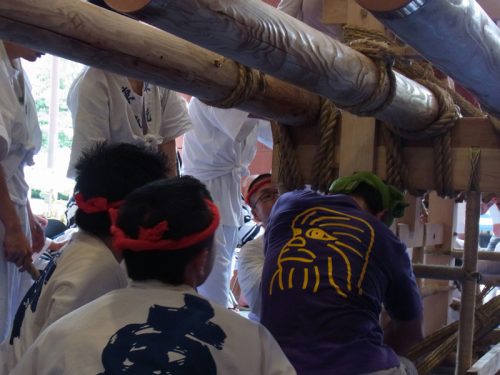 棒締めが終わると、早速試し舁きの準備へ。台上がりを行った中藤総務は舁き縄を鉄砲代わりに持ち、その時を待ちます。