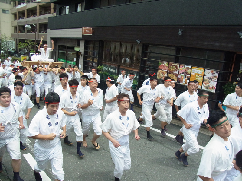 交通係よりOKの合図が出ると、鬨の声と共に山笠台が駆け出します。試し舁きは僅か500メートルほど。それでも男たちの熱気のこもった一年ぶりのオイサの声に拍手が飛びました。