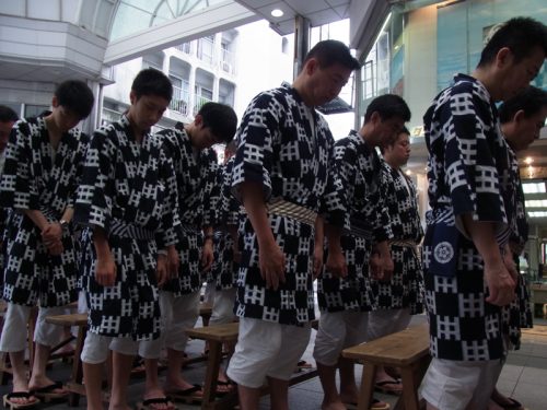 棒洗いの後、山小屋のある呉服町ビジネスセンタービルに戻り、棒締めの行事を行いました。