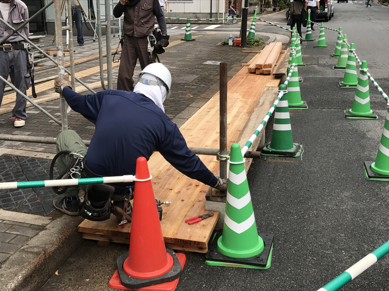 土居流は本日より山小屋の建設が本格的にスタート。今年は歩道に山小屋が建つので、歩道と道路の段差を板で平行にして山小屋建設が行われます。