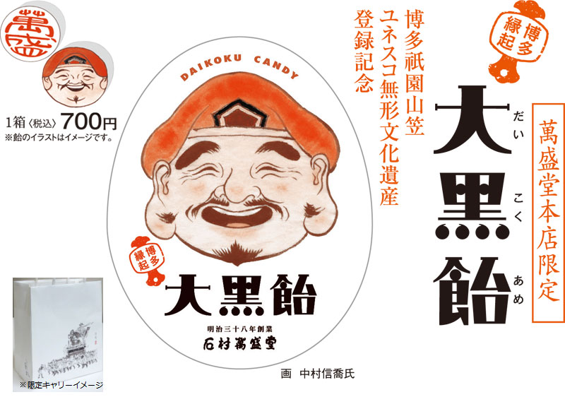 今年創業112年を迎える石村萬盛堂本店(福岡市博多区須崎町)では、博多祇園山笠のユネスコ登録をお祝いし、開催期間に合わせ、本店だけで購入できる限定のコラボレーション商品「大黒飴」(700円)の販売を開始。各所で話題になっています。