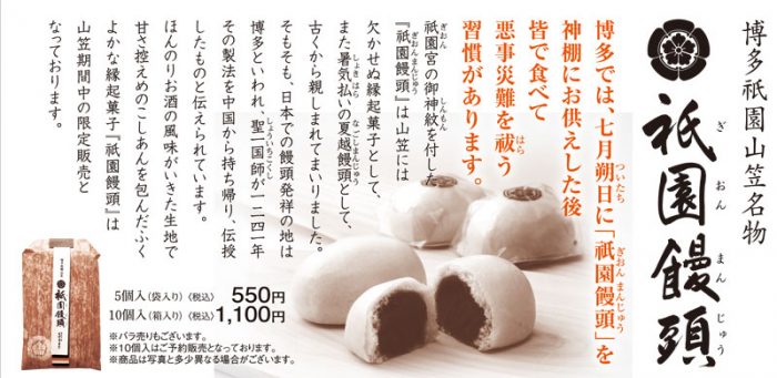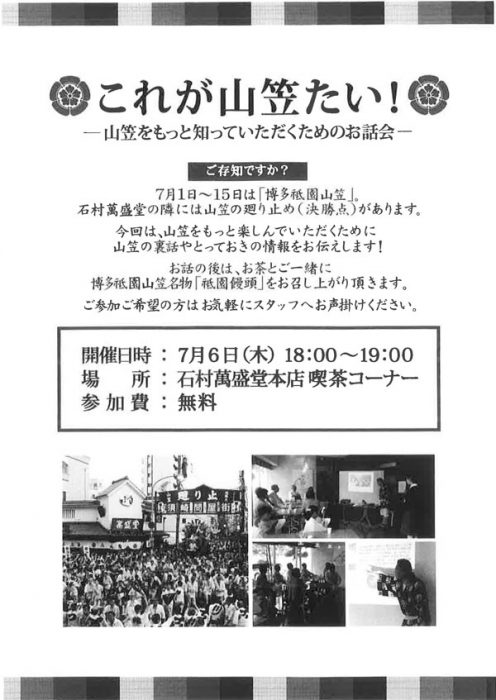また、明日7月6日(木)18時~19時に、「これが山笠たい!-山笠をもっと知っていただくためのお話会-」を石村萬盛堂本店喫茶コーナーにて開催。山笠の裏話やとっておきの情報が聞けるかも?! お話の後は、お茶と一緒に祇園饅頭を頂けます。ご参加希望の方は石村萬盛堂さんの本店までお尋ねください。