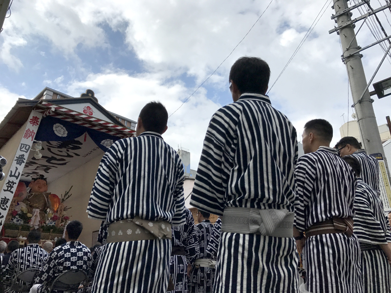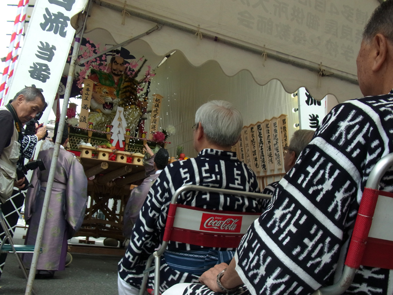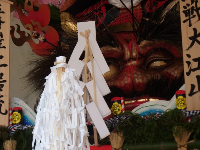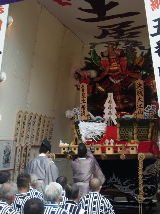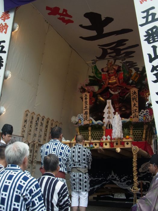 昨年までは土居流の飾りは中村信喬人形師が手掛けていましたが、今年より息子の中村弘峰人形師に引き継がれます。中村弘峰人形師初めての舁き山人形は「決戦大江山(けっせんおおえやま)」。大江山の鬼退治の話をテーマにした飾りで、踏みつけられた巨大な鬼の顔がとても迫力があり、見物に来た人が驚嘆の声を上げていました。