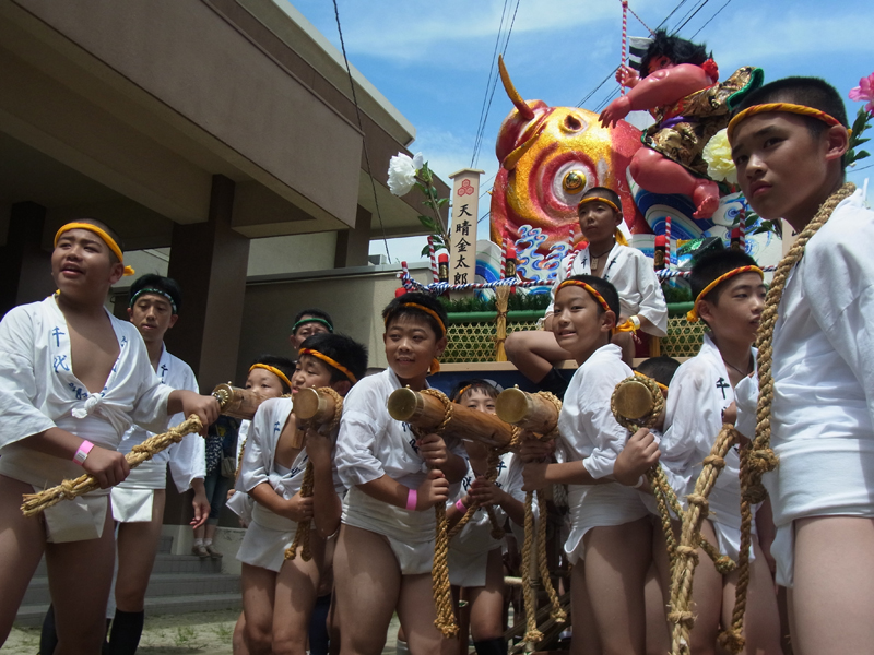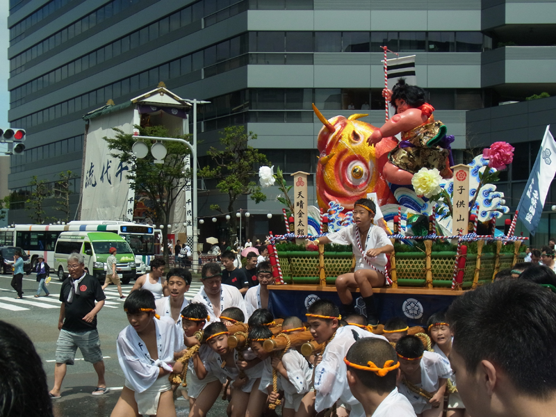 今年の標題は「天晴金太郎」。強い日差しが降り注ぐ快晴となった午後2時より舁き出され、千代小学校を出発して子供山は元気に町へ飛び出していきました。