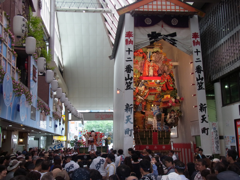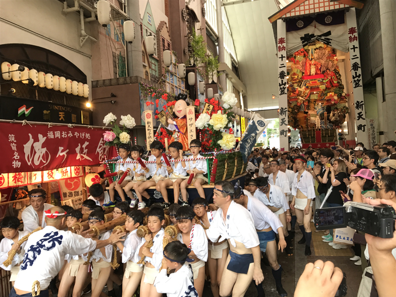 午後3時前、新天町子供山笠がスタート。威勢のいいかわいいオイサの掛け声がアーケードに響き渡ります。