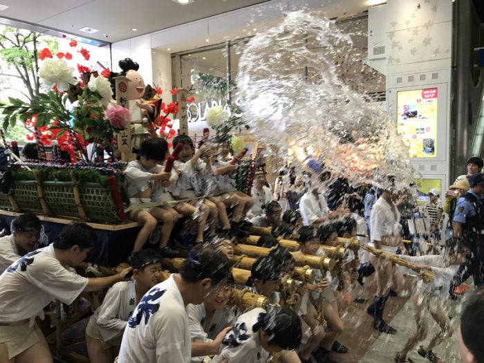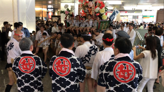 ソラリアステージに舁き入れた後、三越百貨店にも舁き入れて、子供山笠が表敬訪問を行いました。