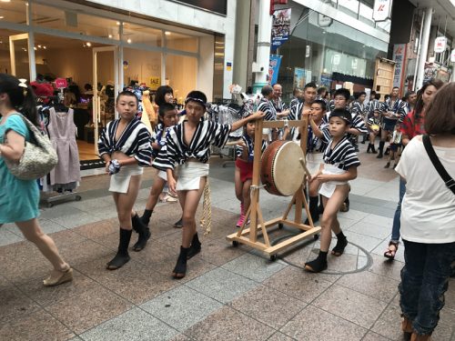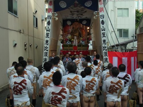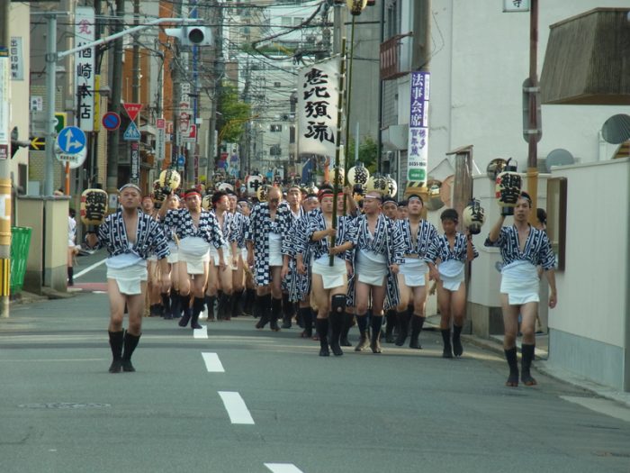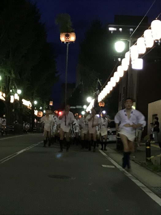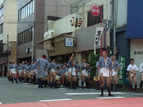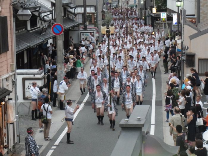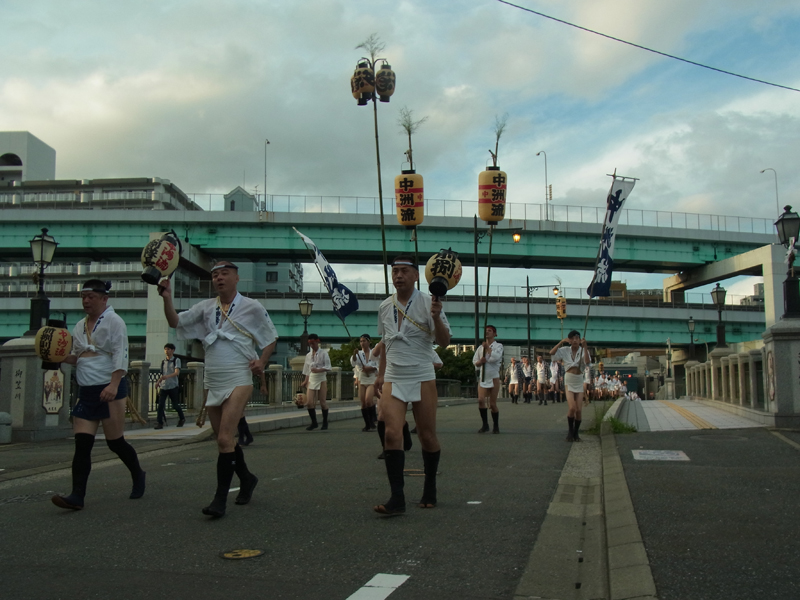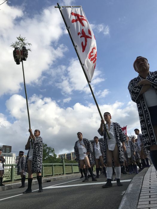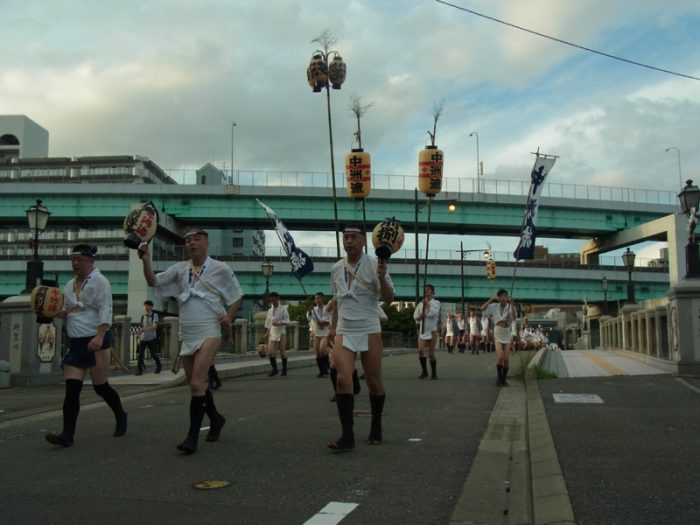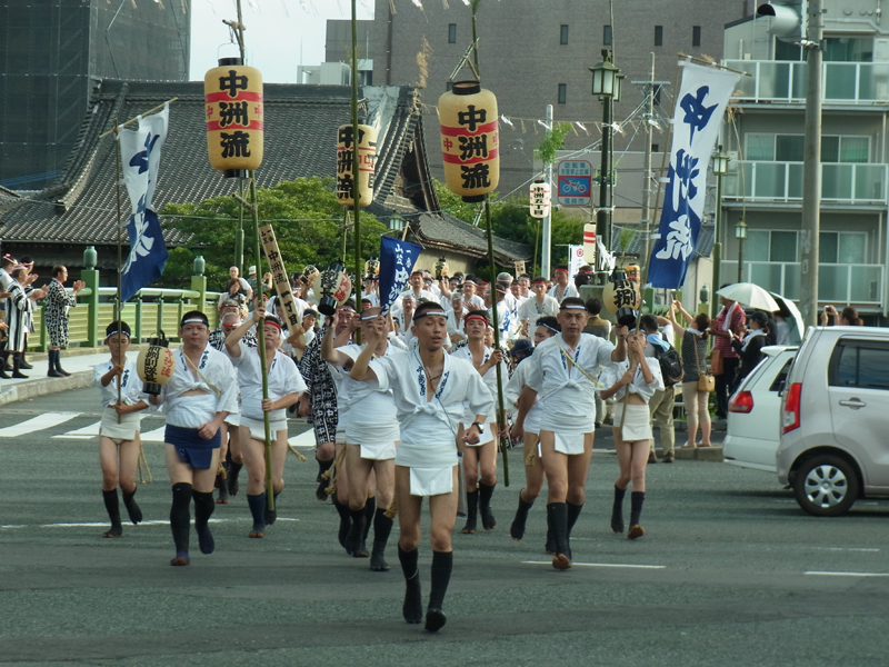 中洲流は16時前より、準備が整ったことを伝令する「もーろーろー」を行いました。各町の詰所に、当番町が出向き「もーろーろー(もうどうぞ、いらっしゃってください、の意味)」の掛け声をかけて回ります。