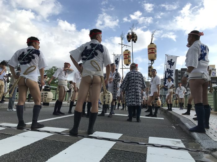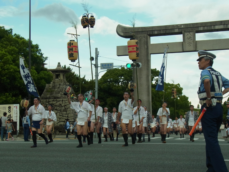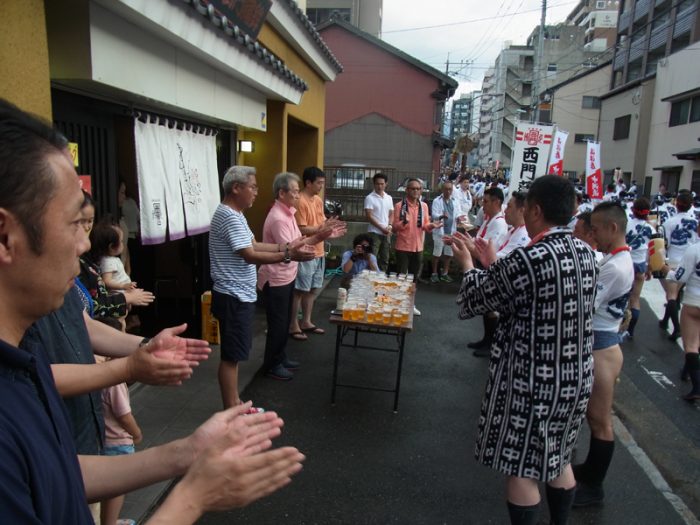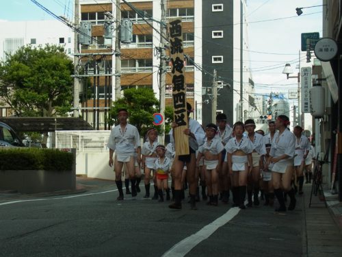 中洲流はお汐井取りの戻りの道では、スタートの石堂橋から博多部に戻るのではなく、一本手前の西門橋から博多部へ入ります。これはその昔、中洲流が結成される前、加勢町として土居町流に参加していた頃、土居町流が西門橋から博多部に入っていたことから、今もそれにならっているのではないかとのことです。