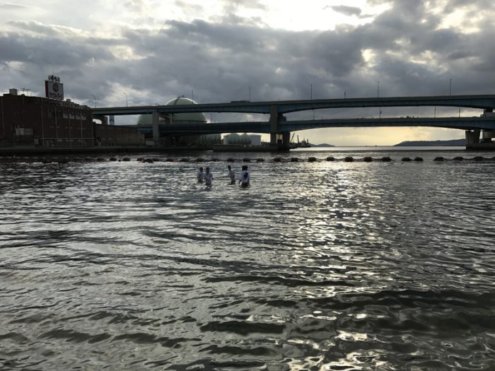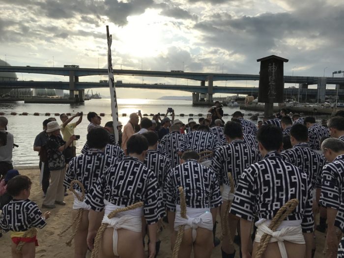出発して30分後、中洲流は無事筥崎浜に到着。鳥居をくぐり、日がゆっくり沈みゆく筥崎浜に向かい拝礼を行い、今年の山笠の無事奉納を祈願します。