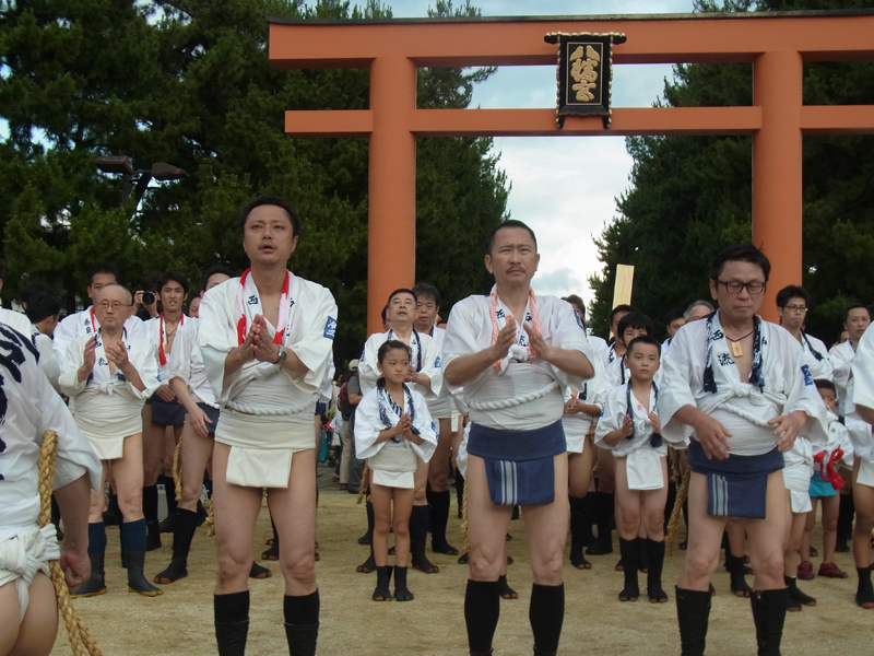 他の流も次々と筥崎浜に到着。海に向かって拝礼を行い、筥崎宮でお祓いを受けます。