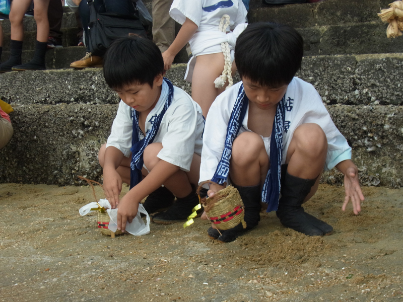 拝礼が終わると、参加者は持参した「てぼ」と呼ばれるカゴやお汐井枡に浄めの真砂をを詰めて持ち帰ります。