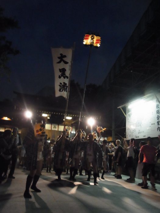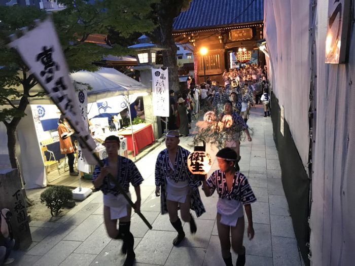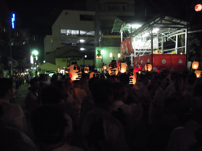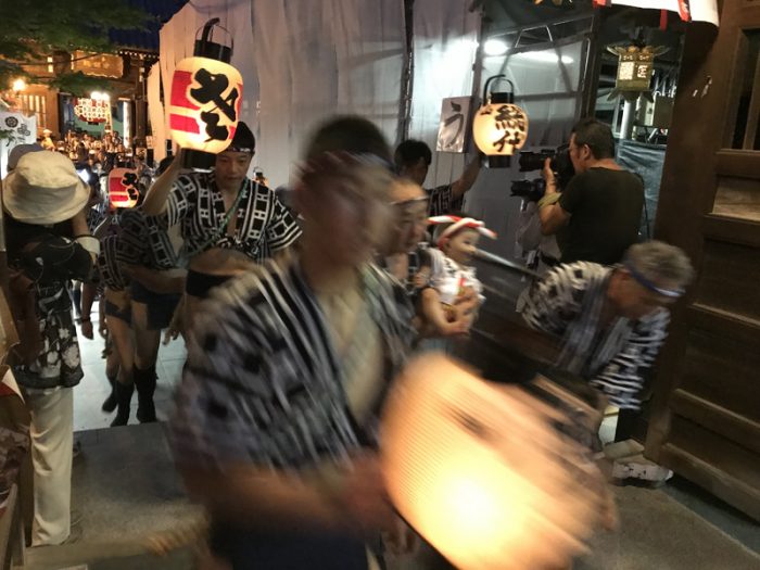 七番山笠 東流が櫛田神社に到着した時は、午後8時過ぎ。辺りはとっぷりと日が暮れ、各町の提灯が暗闇に明るく映える光景は幻想的です。