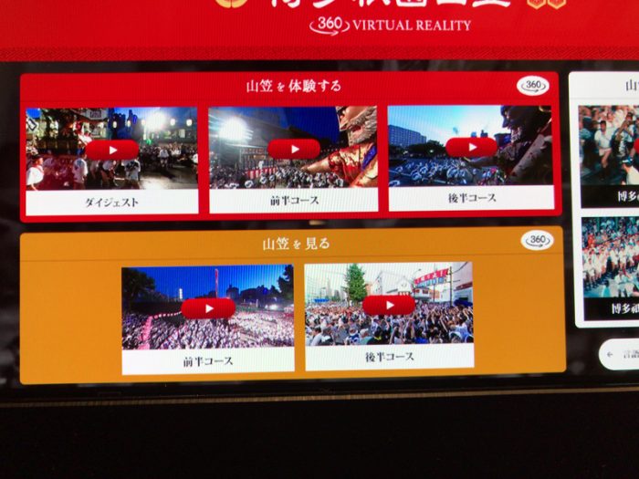 体験できる映像は、2017年の博多祇園山笠の模様。「台上がり」視点と「見物客」視点、そして博多祇園山笠の解説の3種類(それぞれ2~3パートに分けて収録)。映像は2分から3分程度の長さで、選択した驚異の映像の世界がゴーグルを通して広がります。