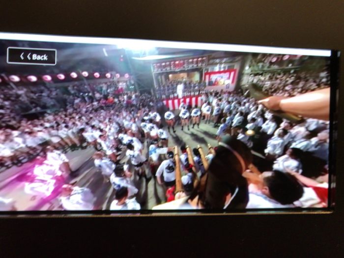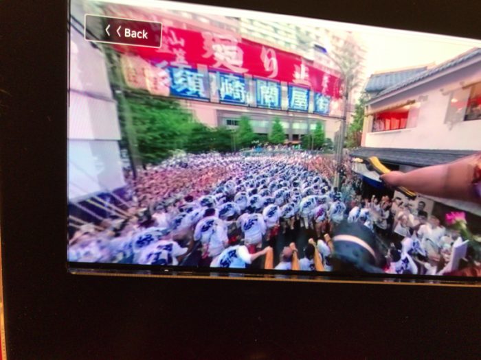 特に、台上がり視点の映像は圧巻の一言。追い山の櫛田入りを撮影した映像では一番山だけに与えられる『祝いめでた』の光景も疑似体験でき、台上がり視点で能舞台を真正面から見据えることができます。