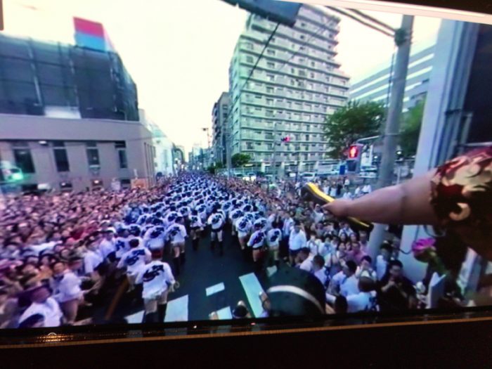 追い山のゴールである廻り止めに向けて最後の力を振り絞る舁き山の映像では、沿道が見物客で埋め尽くされている様子がよくわかり、近づく廻り止めの看板がえも言えぬ高揚感を感じさせてくれます。廻り止めを通過したら眼前にテレビカメラのやぐらを末梢面から見ることができるのも、この映像ならではです。