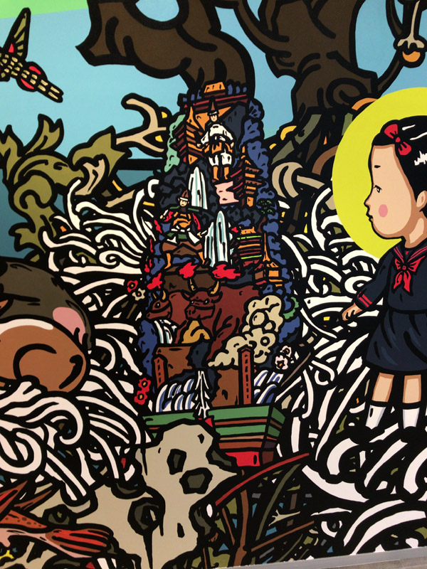 また、この「博多旧市街プロジェクト」の一環として、福岡アジア美術館の1階エントランスに巨大な壁画が登場。高さ約4メートル、幅約11メートルのこの巨大は壁画は、中国人アーティスト、卜樺(ブーホァ)氏が描いもので題名は「最良のものはすでにある」。絵の中には、山笠や辛子明太子など福岡に関する6つの絵が散りばめられています。