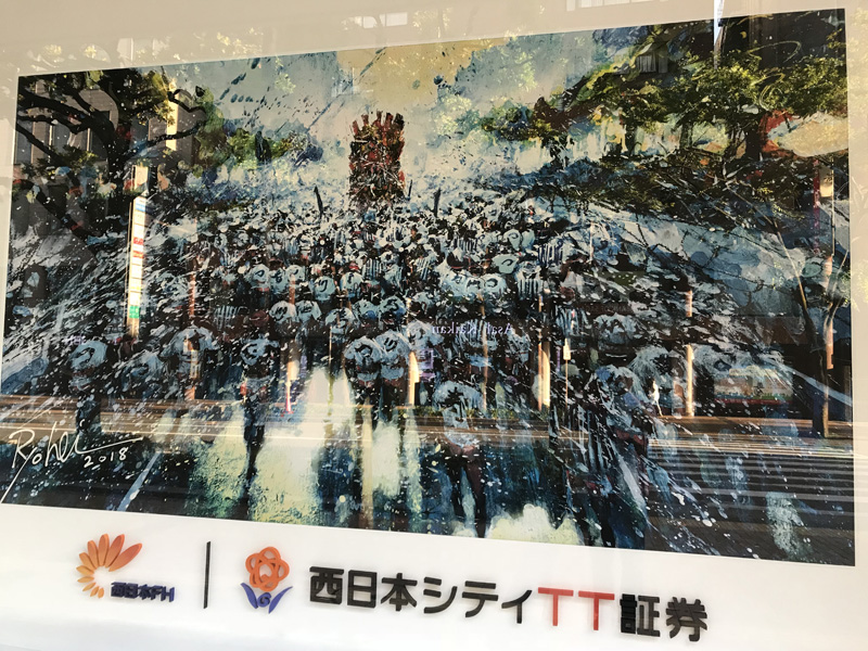 6月1日に合わせ、天神の福岡証券取引所のショーウインドウに展示されているイラストレーター 山下良平さんの絵も、新作の博多祇園山笠の作品に代わりました。