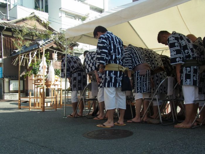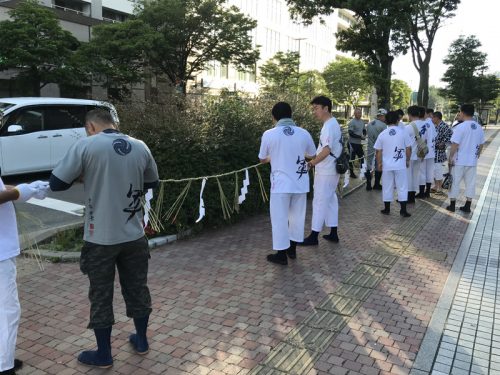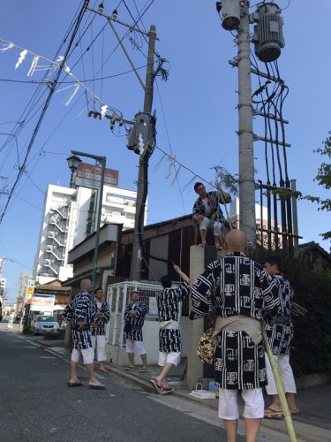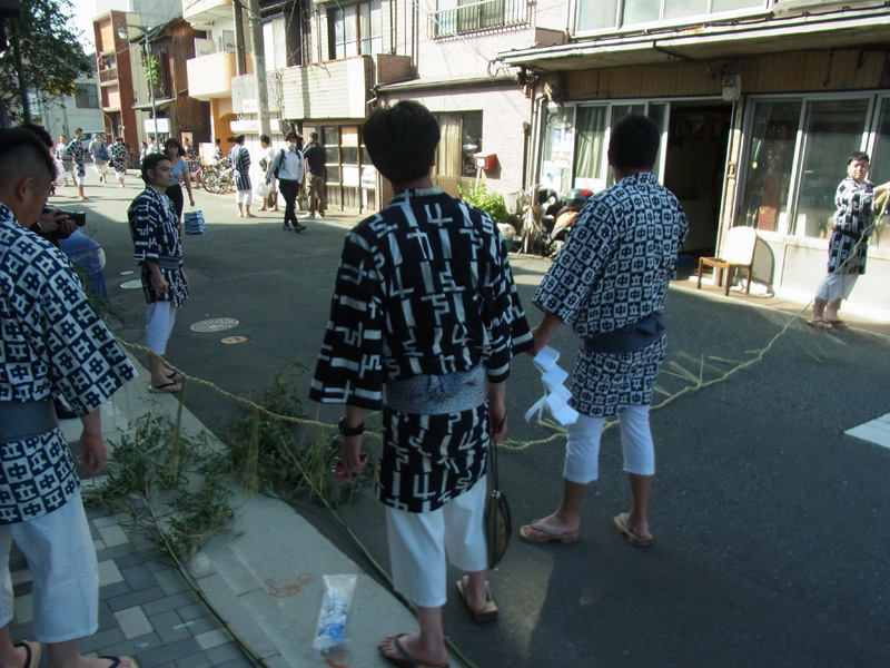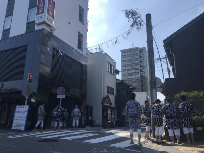 注連下ろしの神事が終わった後、祓い清めた区域の辻に注連縄を張った笹竹を掛けられました。この注連縄が掛かった区域は聖域化され、神様が通る道=山笠が通る道となります。