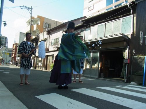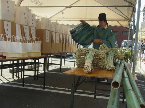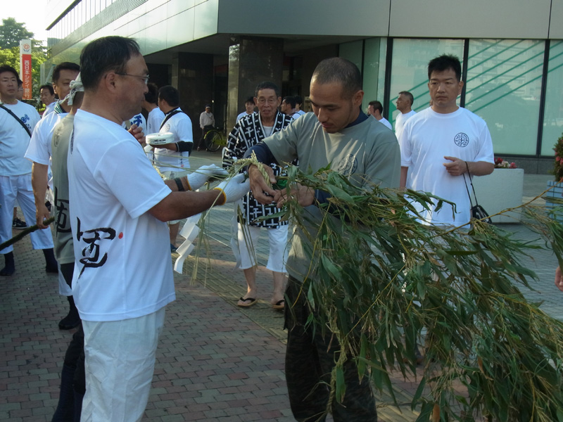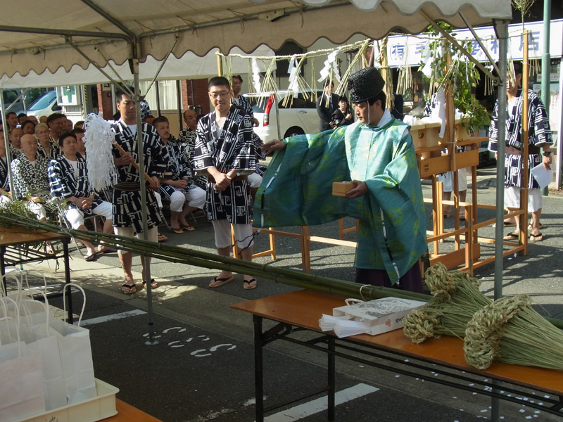 山小屋が建つ区域の辻を祓い清めた後、笹竹と注連縄、山笠に使われる手拭いや道具なども一緒に祓われ清められました。
