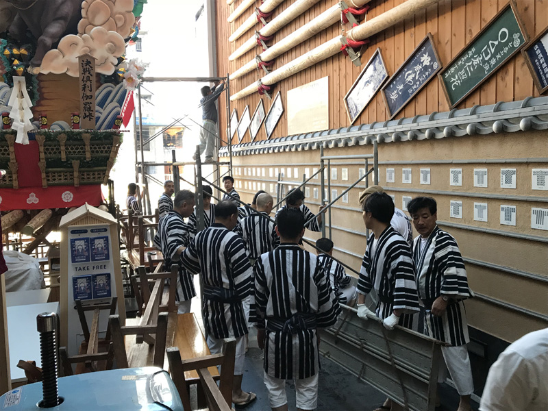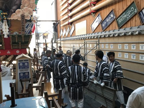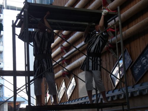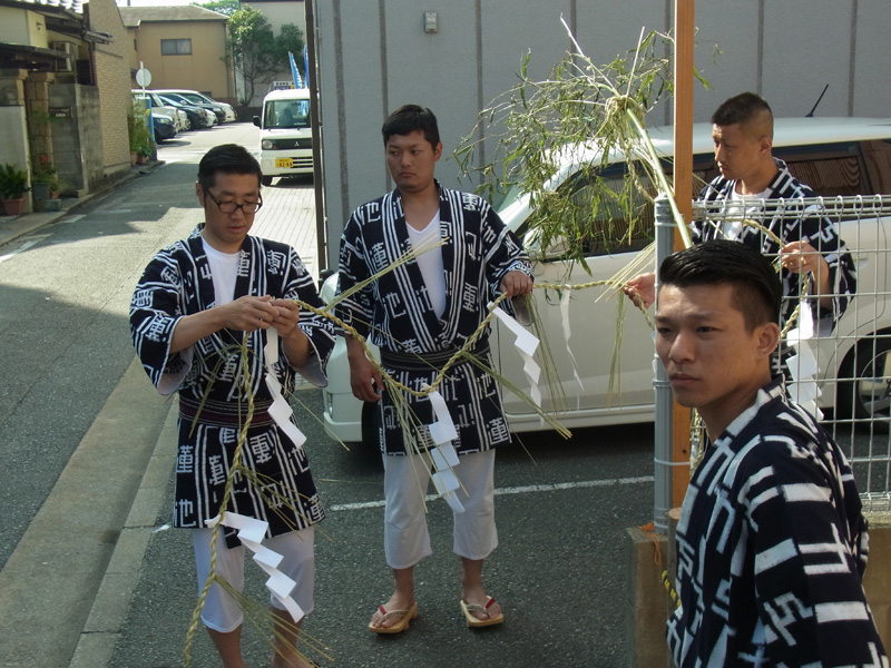 千代流は、午前7時より飾り山の山小屋周辺、舁き山の山小屋周辺に注連縄を掛けました。
