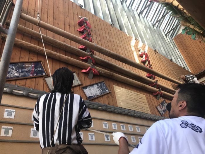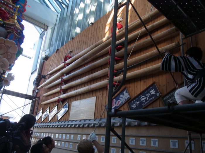 上川端通は、棒洗い神事のために上川端商店街の川端ぜんざい広場の壁に架けてあった舁き棒を朝7時より下ろす作業を行いました。