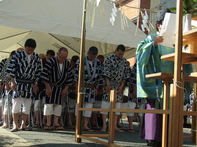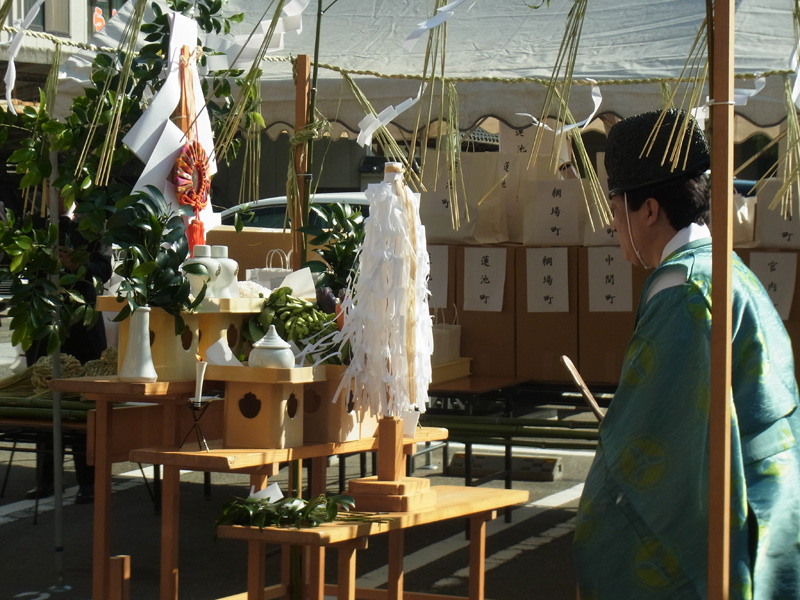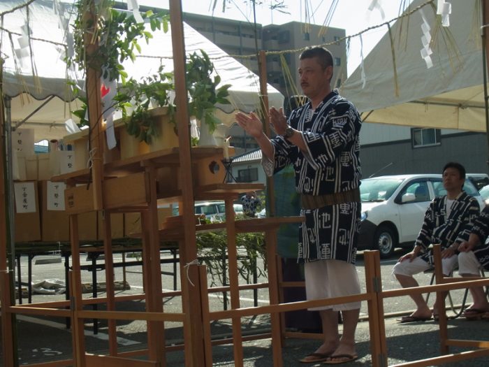 祝詞奏上が行われた後、山笠台の材料や道具等を、櫛田神社の神職が一つ一つ祓い清めて回ります。