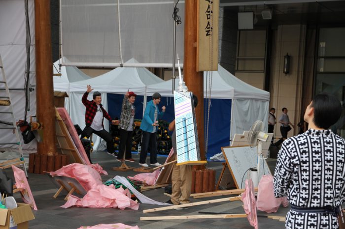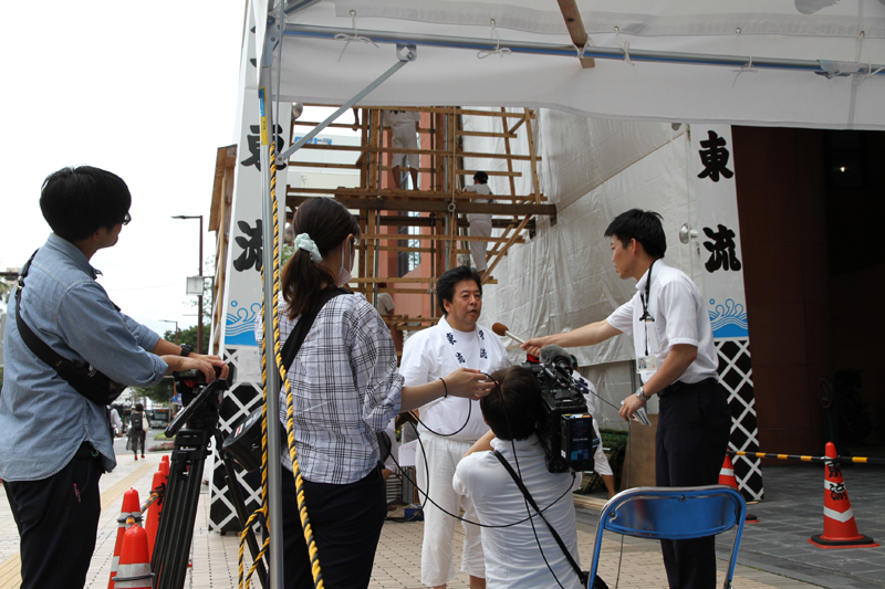 大通りに面する飾り山のため、毎年注目される東流の飾り山。この飾り付けの模様の取材に来たテレビクルーが、飾りを手掛けた白水人形師に取材する光景も見られました。